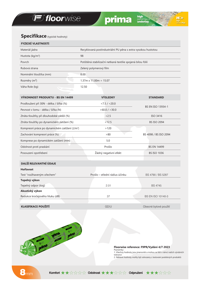 Podložka FLOORWISE PRIMA je vyrobená z recyklovanej polyuretánovej peny. Tá sa vyrába výrobným procesom za použitia tlaku a tepla, ktorými je recyklovaný materiál zlisovaný dohromady, a vytvára tak hustú, pružnú a ľahkú podložku. Jadro z tejto peny dosahuje veľmi vysokú hustotu, a to celých ±98 kg/m3, zvuková izolácia potom dosahuje hodnotu 37 dB. Spodná vrstva je opatrená zelenou mikrofóliou. Ide teda o prémiový, kvalitný a po všetkých stránkach poctivý a do detailov prepracovaný výrobok, ktorý po pokládke vnesie Vášmu interiéru doslova nový rozmer komfortu a používania.