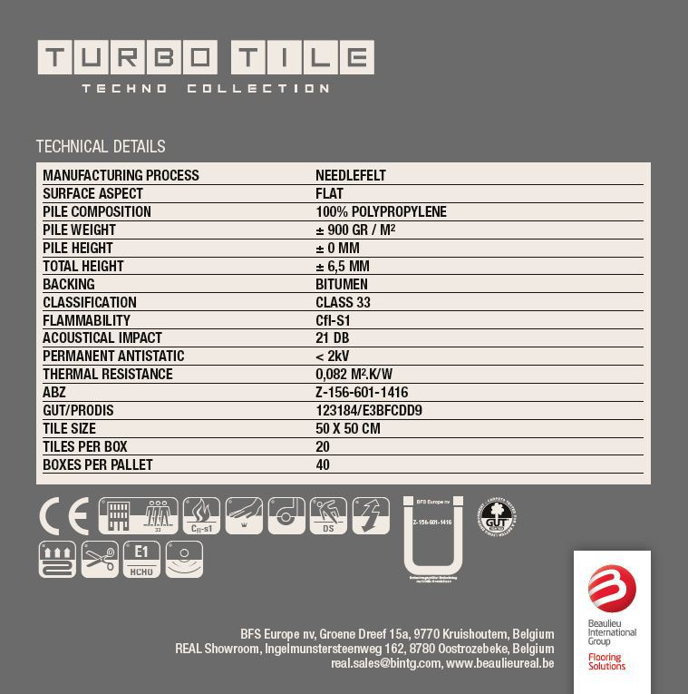 Vpichované polypropylénové vlákna potešia nenáročnosťou na údržbu. Podklad tvorí pevný bitúmen, ktorý dodáva koberci na odolnosti. Kobercové štvorce Turbo môžete umiestniť do frekventovaných zón, sú vhodné k stálemu užívaniu kolieskových stoličiek, tlmia krokový hluk a môžete ich položiť aj do priestorov s podlahovým vykurovaním.